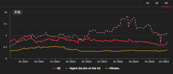 - Do VJC là doanh nghiệp trong VN30 nên định giá P/B của doanh nghiệp luôn ở ngưỡng trên 3.x nhưng so với định giá toàn ngành hàng không nói chung ở mức trên 5.x thì VJC luôn rẻ hơn khá nhiều.