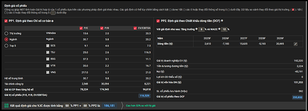 - Do chi phí khấu hao tài sản lớn, ngành nghề dịch vụ và có dòng tiền đều nên áp dụng 50% định giá P/B, P/E và EV/EBITDA và 50% định giá chiết khấu dòng tiền ta có được mức giá hợp lý của VJC là 186100 VNĐ/cổ phiếu, tương ứng mức upsize 53% từ mức giá đóng cửa hiện tại.
