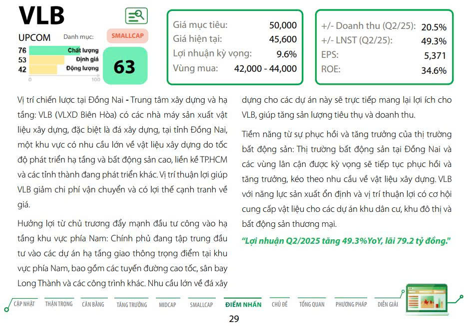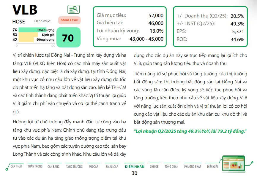 Với lợi thế về trữ lượng mỏ đá và khả năng gia tăng công suất, VLB đang ở vị thế thuận lợi để hưởng lợi từ các cơ hội trong giai đoạn đầu tư công đang được đẩy mạnh. Kết quả kinh doanh quý 1/2025 là dấu hiệu tích cực, và chúng tôi kỳ vọng VLB sẽ vượt kế hoạch cả năm. Định giá cổ phiếu hiện tại của VLB rất hấp dẫn, tạo cơ hội cho các nhà đầu tư quan tâm đến ngành đá xây dựng và đầu tư công.