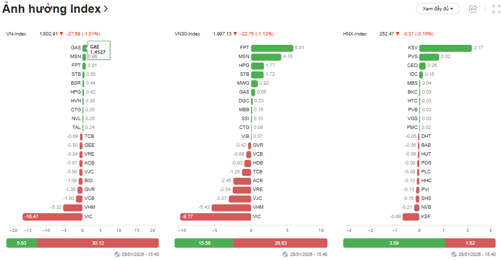 Thị trường chứng khoán ngày 28/01/2026 khép lại trong trạng thái cảm xúc cực độ. Chỉ số VN-Index giảm sâu 27,59 điểm (-1,51%), lùi về mốc 1.802,91 điểm. Tuy nhiên, điểm nhấn lớn nhất không phải là đà giảm, mà là sự bùng nổ của thanh khoản. Giá trị giao dịch đạt 34.585 tỷ đồng, tăng vọt 35,23% so với phiên hôm qua. Điều này cho thấy dòng tiền bắt đáy đã nhập cuộc cực kỳ quyết liệt đối ứng với lực bán tháo.