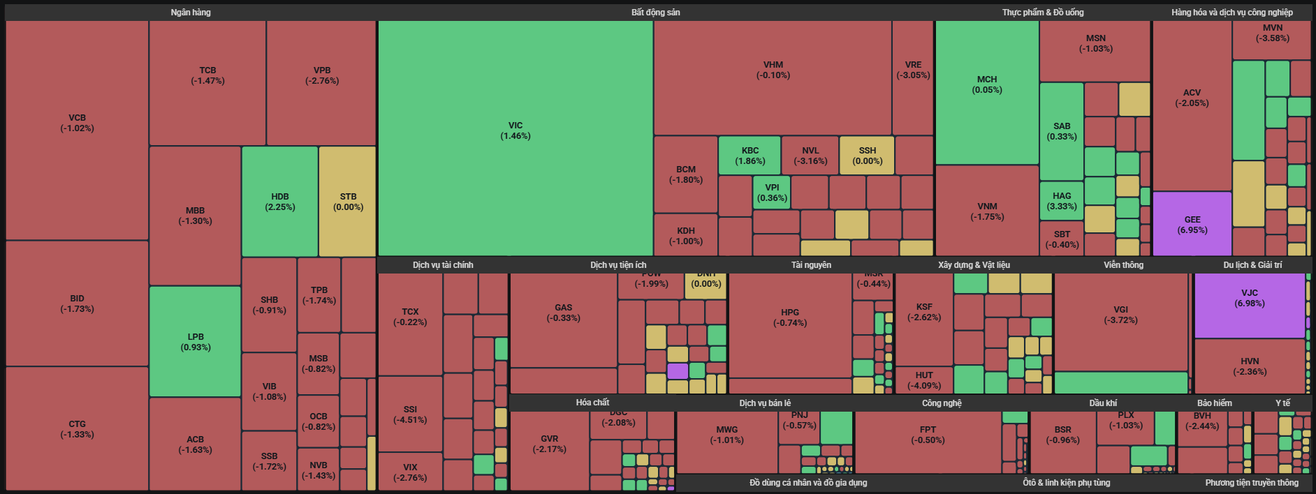 Áp lực bán lan rộng giảm sâu và một vài cổ phiếu rơi sàn nhưng thanh khoản thấp, chưa tạo hiệu ứng hoảng loạn. Nhóm ngân hàng đồng loạt giảm từ 1 - 3%. Nhóm chứng khoán chịu áp lực mạnh nhất với SSI (-4,51%), VIX (-2,76%), VND (-3,19%), SHS (-4,19%) cho thấy tâm lý thoát hàng rõ rệt. Với tình trạng bào mòn hàng ngày thì không quá bất ngờ khi một số cổ phiếu đã lùi về sát đáy tháng 4