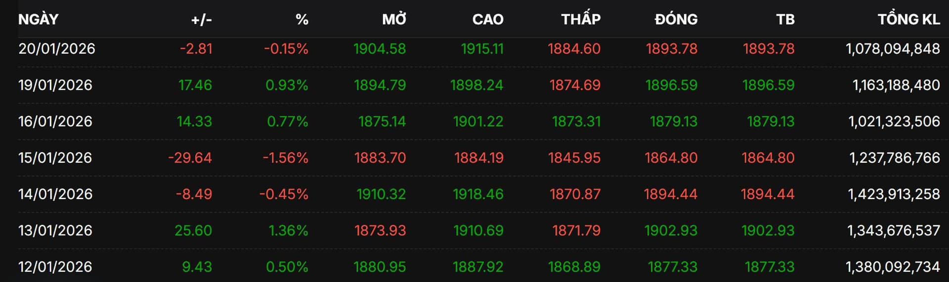 Trong các phiên giao dịch gần đây, VN-Index liên tục chinh phục mốc 1.900 điểm trong phiên, thậm chí có lúc tiến sát vùng 1.915 – 1.920 điểm. Trong 4 lần vượt 1,900 trong 10 ngày qua, có 1 lần VNI đóng cửa trên 1,900 điểm là ngày 13.1.2026 (1,902.93) còn 3 lần VNI đóng cửa dưới 1,900 điểm. Một cách tổng quan, điểm chung là chỉ số đều đóng cửa dưới 1.900, cho thấy thị trường vẫn đang gặp lực cản tâm lý rất lớn tại vùng này
