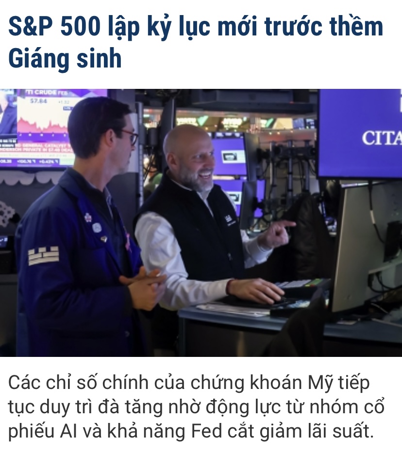 Nay là ngày giao dịch ck Mỹ trước kỳ nghỉ giáng sinh, mai mở cửa ngắn ngày rồi nghỉ holiday. DJ S&P 500 vẫn xanh dù tiền vào ít