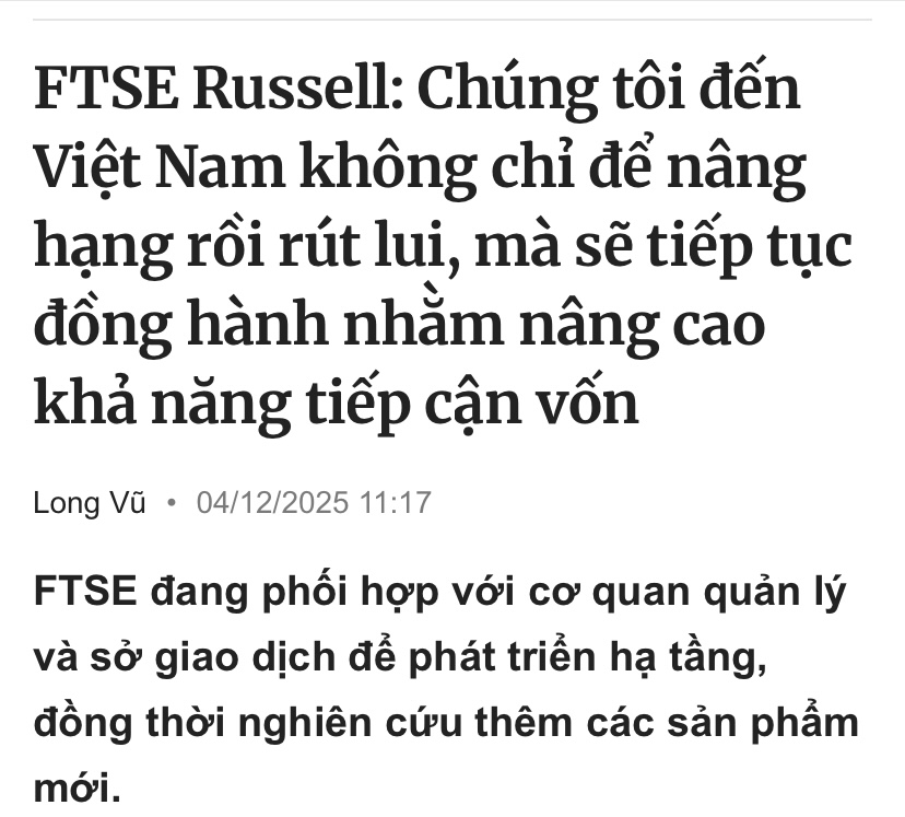 Đáng chú ý, FTSE khẳng định không chỉ hỗ trợ nâng hạng rồi rút lui, mà sẽ tiếp tục đồng hành với thị trường Việt Nam để nâng cao khả năng tiếp cận vốn. FTSE đang phối hợp với cơ quan quản lý và các sở giao dịch để phát triển hạ tầng, đồng thời nghiên cứu bổ sung thêm các sản phẩm chỉ số mới.