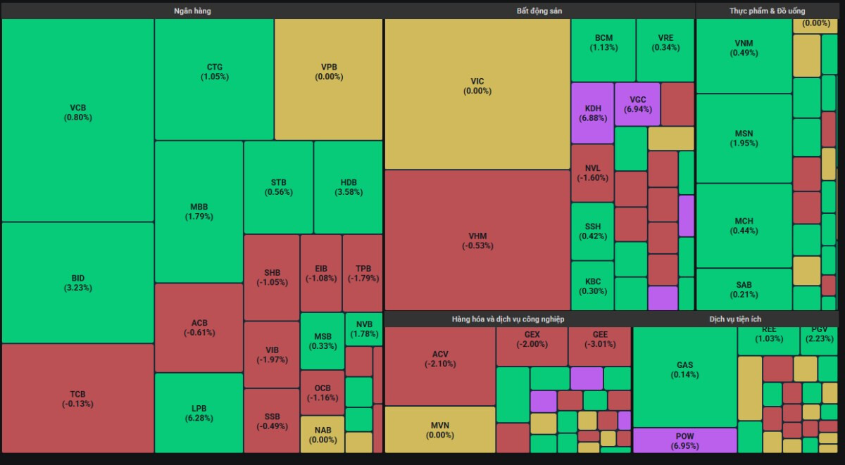 Điểm đáng chú ý là dù chỉ số tăng, độ rộng thị trường lại nghiêng về bên bán . Số mã giảm áp đảo phần lớn thời gian, trong khi sắc xanh chủ yếu tập trung ở nhóm cổ phiếu đầu ngành. Trên bản đồ nhiệt, vùng xanh nổi bật gần như chỉ nằm ở các trụ lớn, cho thấy tâm lý chốt lời đang lan rộng. Đây là tín hiệu cảnh báo rằng VN-Index có thể tiếp tục trải qua các nhịp rung lắc trong những phiên tới.