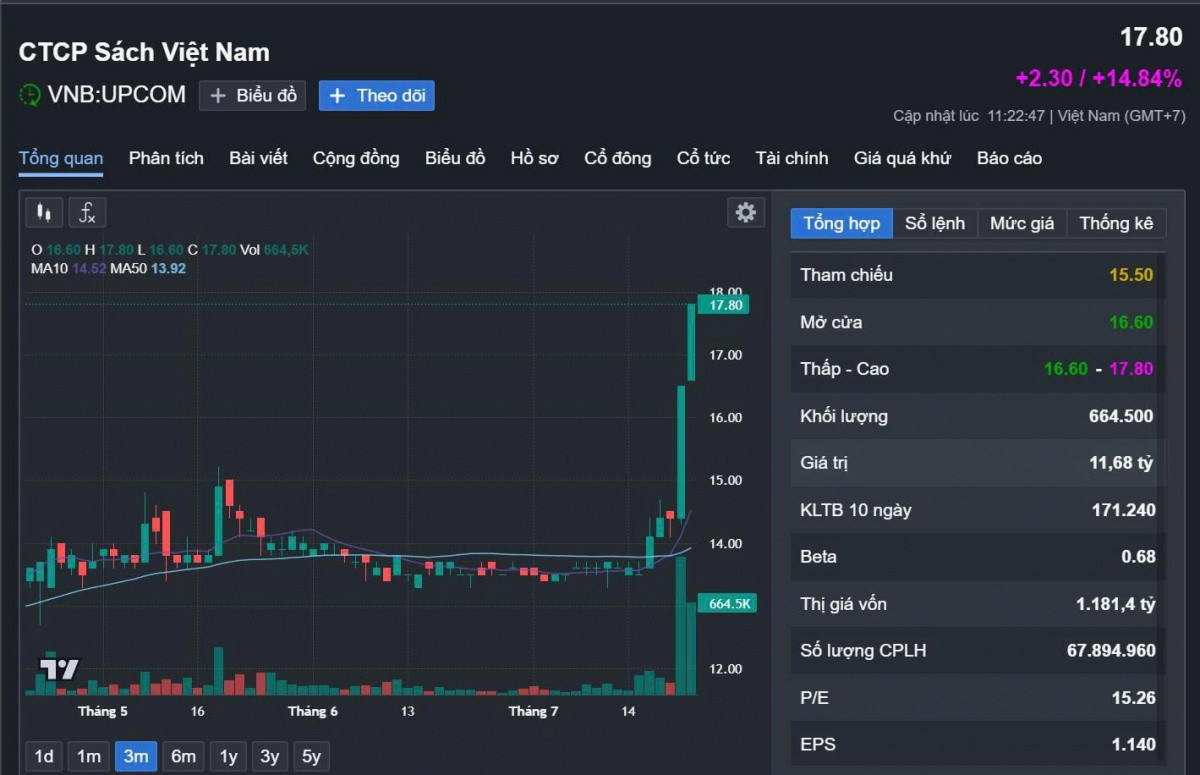 Sau khi công bố kết quả kinh doanh khả quan, cổ phiếu VNB lập tức tăng trần 2 phiên liên tiếp, lên 17.800 đồng/cp, tương ứng mức tăng 24%. Vốn hóa theo đó đạt 1.181 tỷ đồng.
