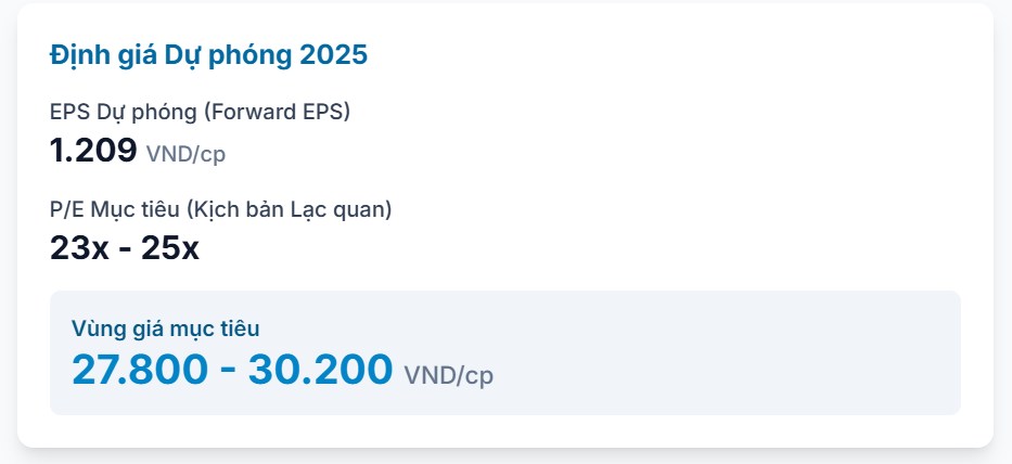 EPS 2025 dự phóng: ~1.209 đ/cổ phiếu (kế hoạch LNST 1.840 tỷ đồng, cổ phiếu lưu hành ~1,522 tỷ).