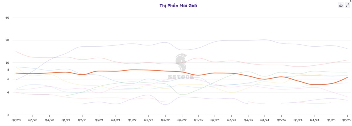 Cạnh tranh gay gắt: Các đối thủ như VPS (phí thấp) và TCBS (hệ sinh thái ngân hàng–chứng khoán) tiếp tục gây áp lực cạnh tranh mạnh, tiềm ẩn bào mòn biên lợi nhuận mảng môi giới.
