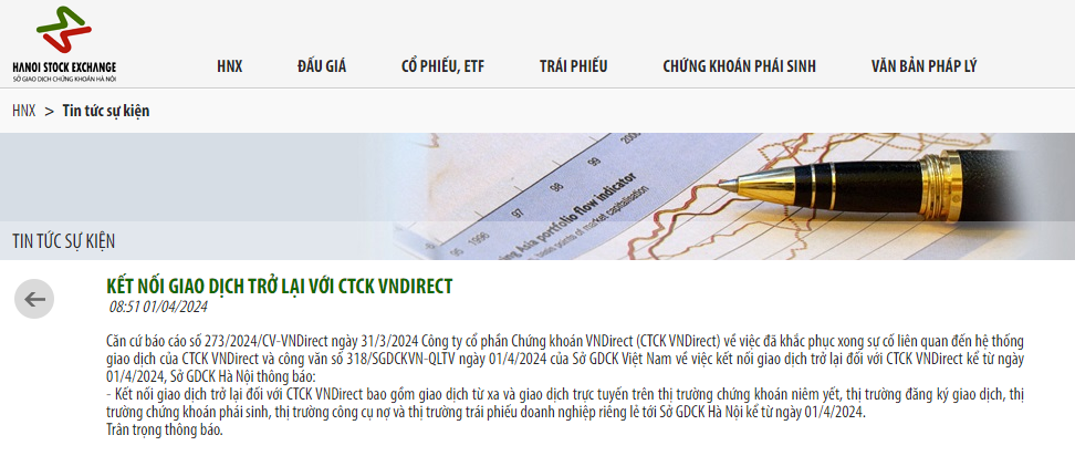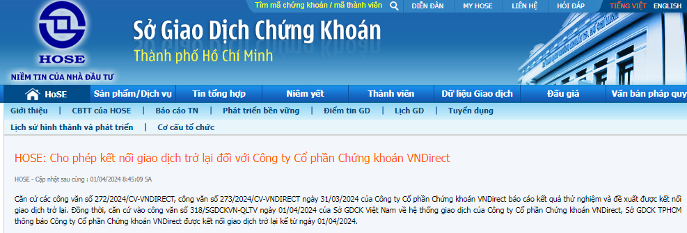 Sáng ngày 01/04/2024, Sở Giao dịch Chứng khoán TP HCM (HOSE) và Sở Giao dịch Chứng khoán Hà Nội cùng có thông báo cho phép kết nối giao dịch trở lại đối với CTCP Chứng khoán VNDIRECT (HOSE: VND).