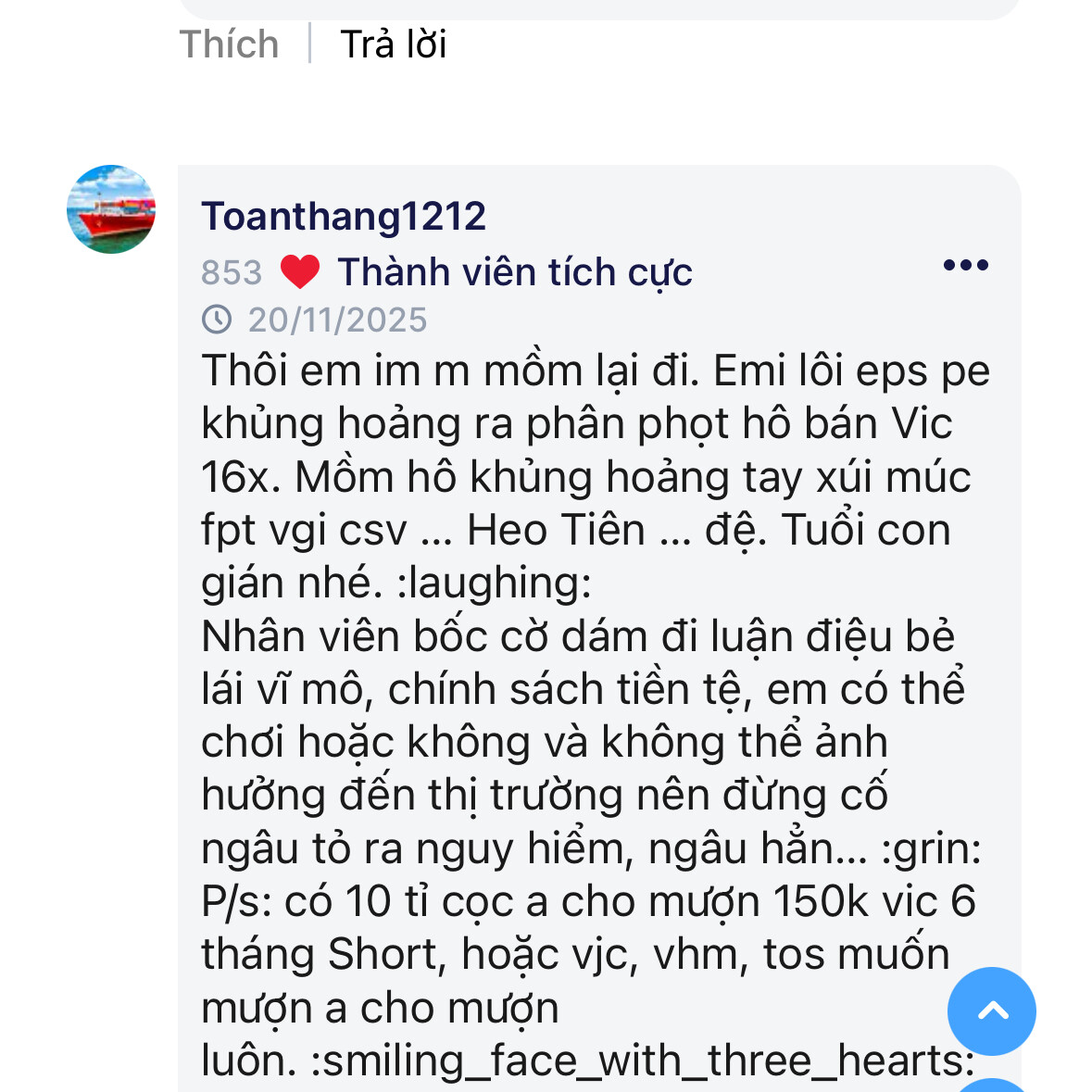 @toanthang1212 đại gia nghìn tỉ khoe giàu còn kêu là làm kho bãi sẵn sàng có tiền cho chị mua chứng khoán. Lại rảnh háng lên diễn đàn tạo nick ảo để nhận bản thân mình là abc…ôi người giàu họ cũng rảnh thật, tưởng người giàu như nào…hoá ra là lũ ba hoa chích choè…giận quá hoá thẹn à Thắng ơi…Chị làm việc quang minh chính đại chứ ko như em. Em đi làm môi giới kho bãi chắc cũng kiếm khá nhỉ. Đoạn này khách cháy khét lẹt em mừng lắm nhỉ. Hay chính em là thằng chơi kho đó em? Nhận là già là đàn anh mà cư xử như 1 thằng trai lơ xoàng xĩnh. Im đi thì đỡ lộ bài. Đại gia kiểu lân la diễn đàn cắn dạo khắp nơi…nể cho đại gia quá.