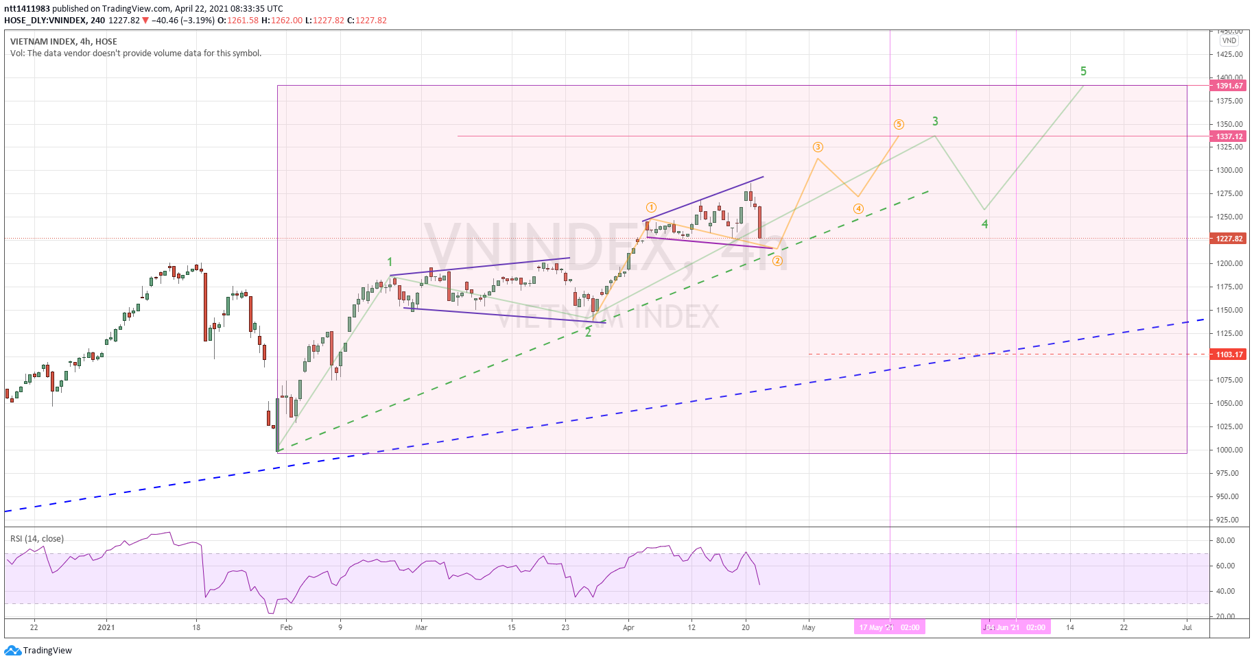 Còn dùng cờ điều chỉnh thì phiên nay tạm chỉ coi là 1 phiên chỉnh cho dạng cờ mở rộng của sóng 5.3.2, điều nghi ngại là biên độ quá lớn, tạo lực bẻ gãy trend tăng ngắn hạn.