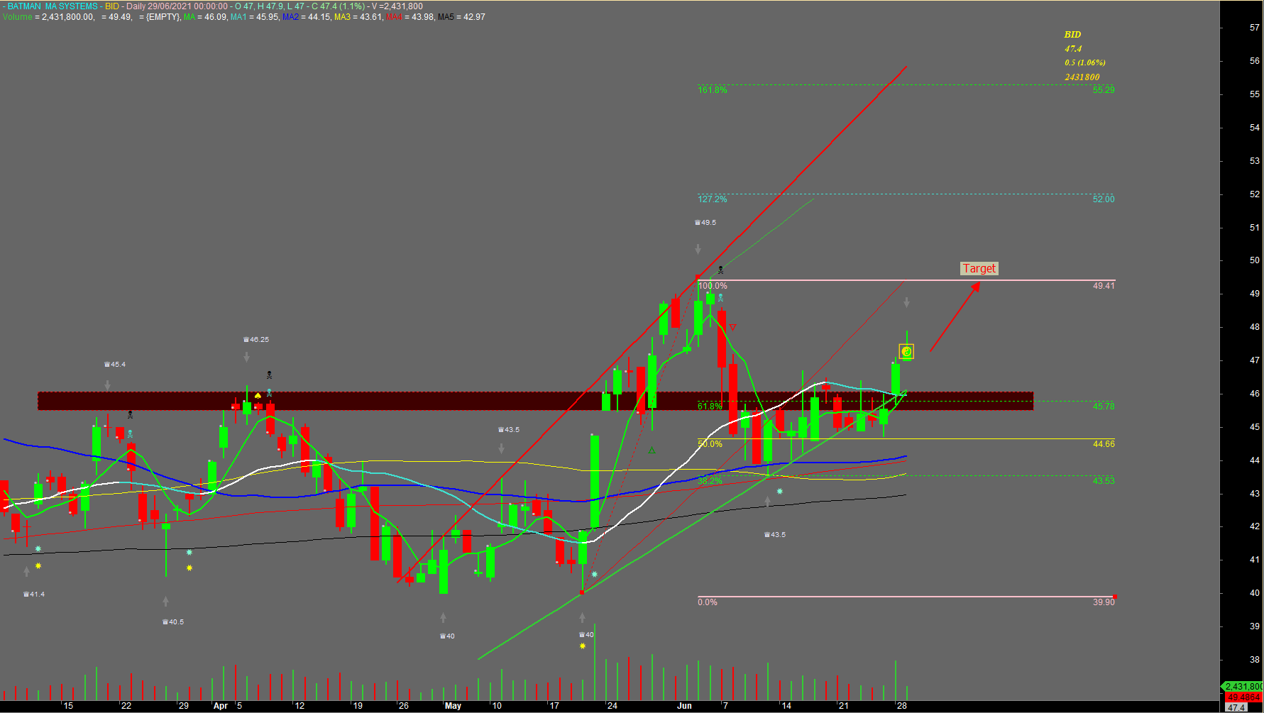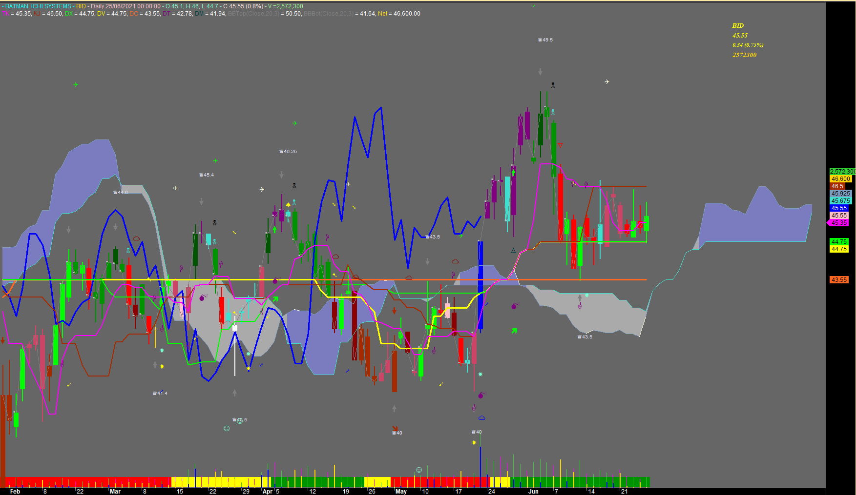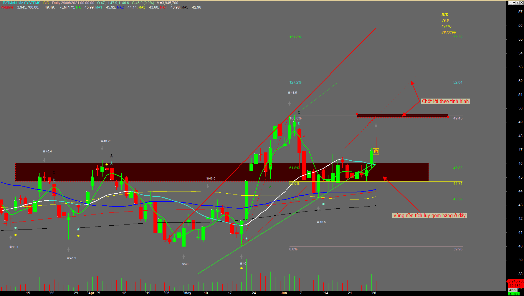 Bid đang tích lũy tại vùng hỗ trợ 44.75 còn một hỗ trợ cứng ở dưới vùng giá 43.65. Có thể tham gia mua lấy vị thế khoảng 15-20% chờ giá vượt 46.5 thì mua gia tăng. Mục tiêu đỉnh cũ 49.5