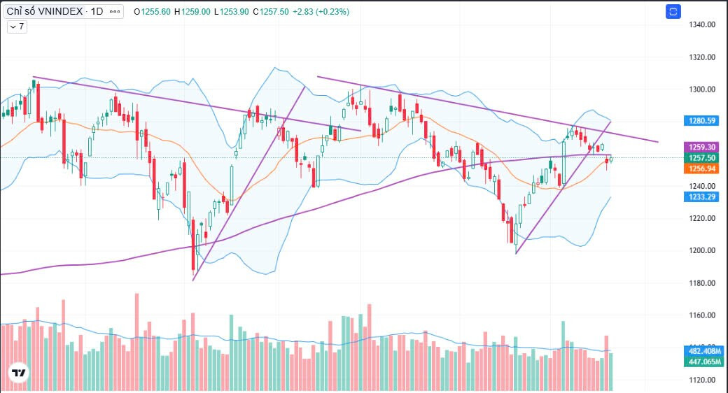 VNI tăng 2.83 điểm, tương ứng 0.23%. Đóng cửa 1257 điểm với thanh khoản 3 sàn: GTGD 15,678 tỷ đồng, KLGD 701 triệu cp (thấp hơn trung bình 20 phiên gần nhất). Toàn thị trường có 454 mã tăng giá, 810 mã đi ngang và 285 mã giảm giá.