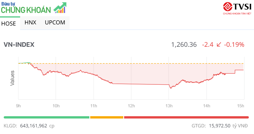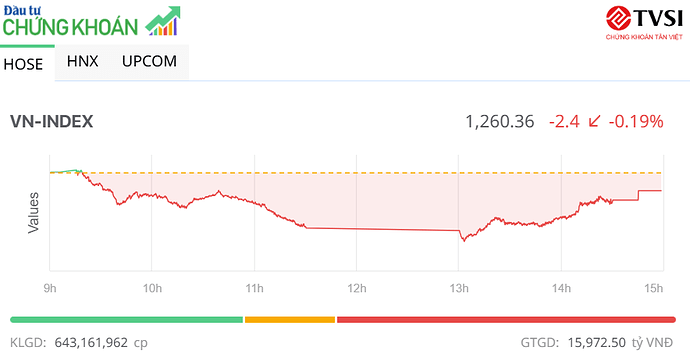 VNI giảm 1.17 điểm, tương ứng -0.09%. Đóng cửa 1272 điểm với thanh khoản 3 sàn: GTGD 15,961 tỷ đồng, KLGD 732 triệu cp (ngang bằng trung bình 20 phiên gần nhất). Toàn thị trường có 365 mã tăng giá, 834 mã đi ngang và 361 mã giảm giá.