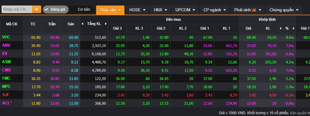 Tâm điểm hôm nay là nhóm thủy sản tăng trần tím (sau nhóm thép hôm qua)
