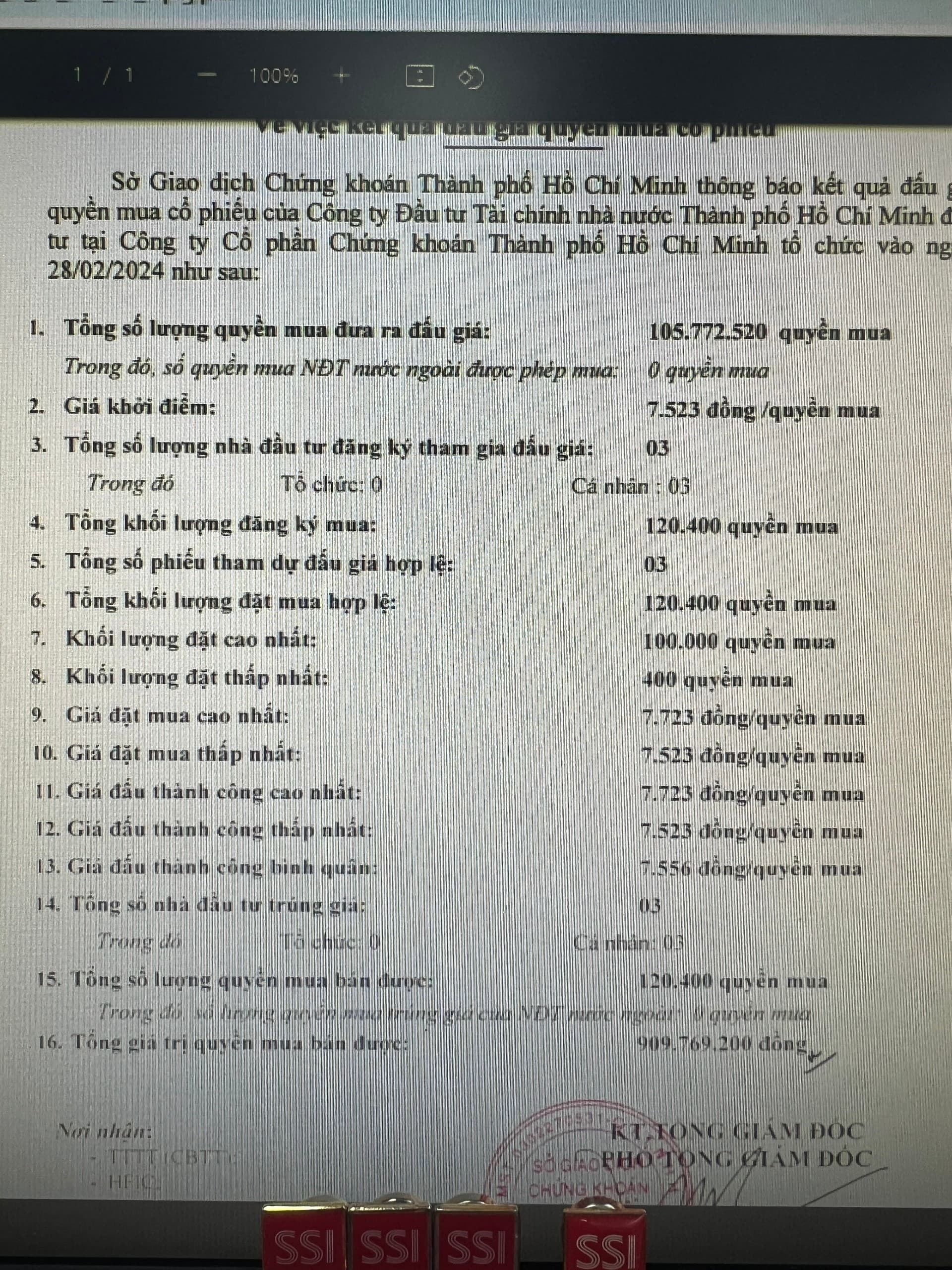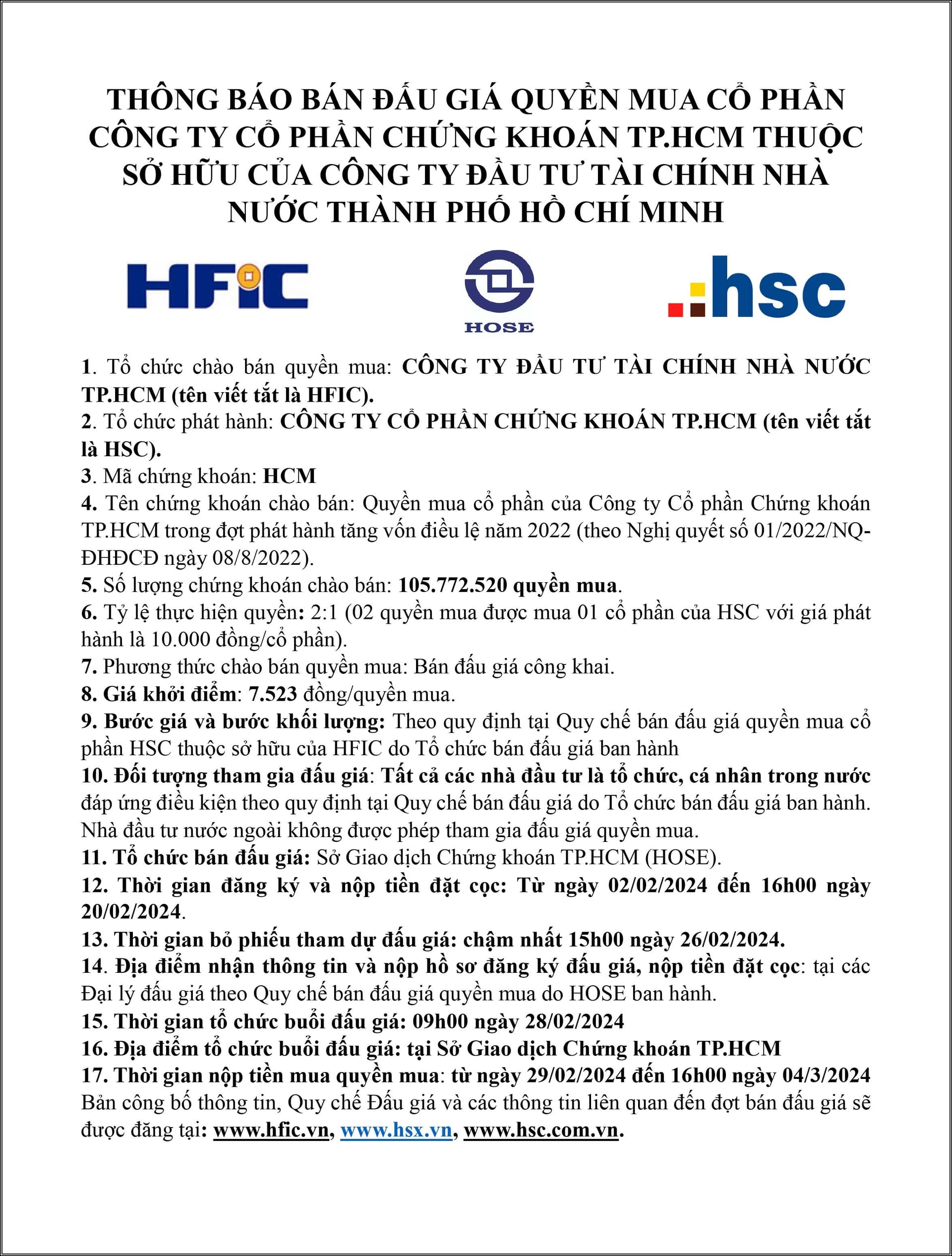 HFIC đấu thầu cổ phiếu HCM, chi tiết trong hình.