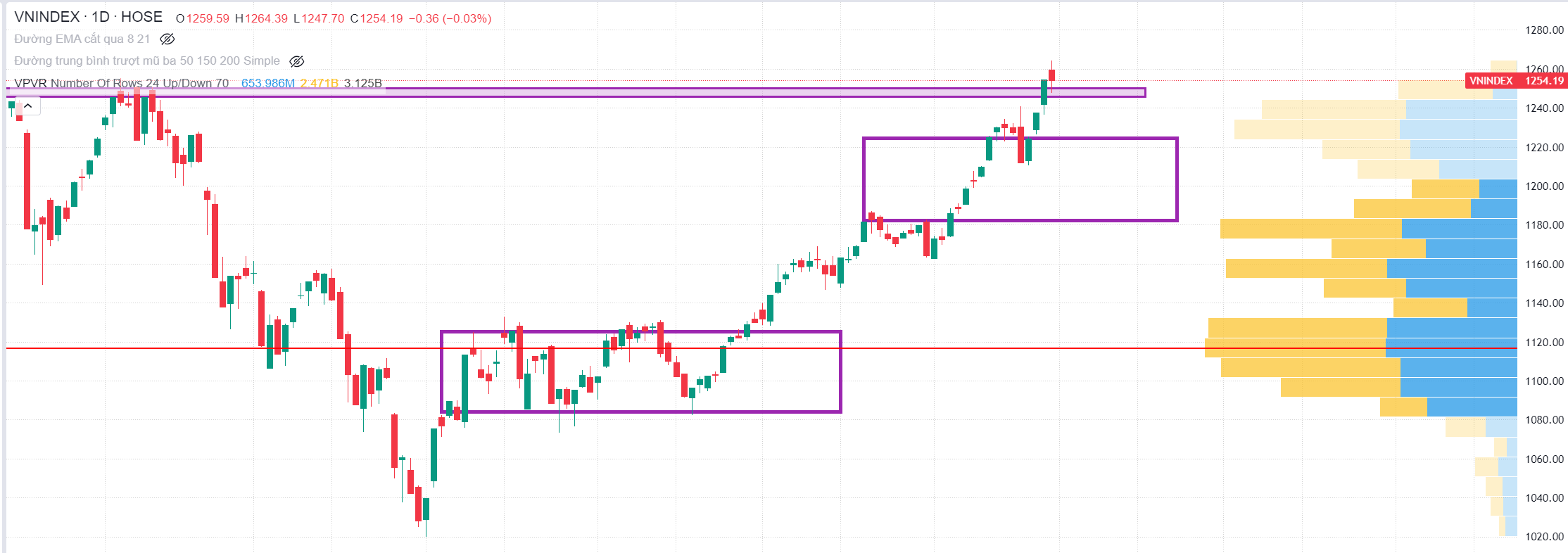 Đoạn này rủi ro ngắn hạn mình đánh giá là có, target lúc đầu mình là sideway quanh 1200 rồi mới đi lên, ai ngờ bật mạnh quá làm mình cũng phải suy nghĩ lại. Phiên ngày 23 là một phiên phân phối, thì cần thêm nhiều phiên TT mới dứt trend tăng được.