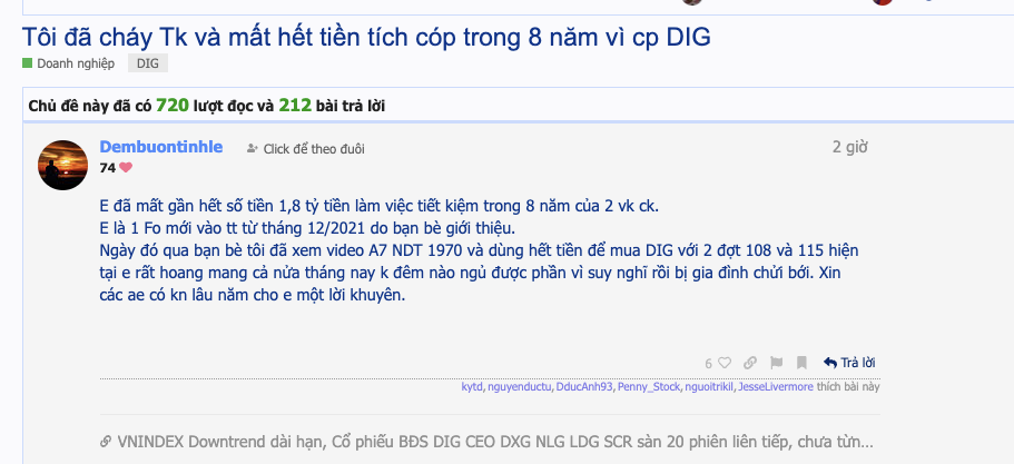 Tôi bán cả công ty, bán 3 cái nhà 15 năm làm việc vất vả. cuộc đời quá khắc nghiệt. biết vậy không nghe lôi kéo vào DIG CEO và chứng khoán.