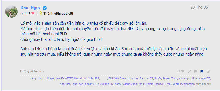 Sao Thiên Tân lại bán đúng đáy xong hôn sau nhà ctich lại đăng ký mua vào nhỉ, aem nào thông não hộ phát. Kéo lên để xả hay nhà ctich ko có tiền phải bán lấy tiền kéo lên, hay giá DIG ko đáng 31.5 ngày Thiên Tân bán?