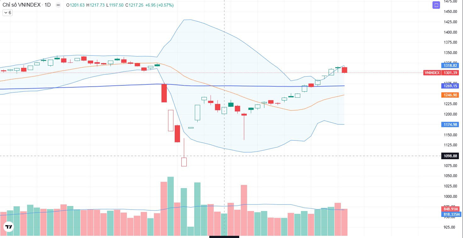 VNI tăng 16.3 điểm, tương ứng 1.26%. Đóng cửa 1309 điểm với thanh khoản 3 sàn: GTGD 29,572 tỷ đồng, KLGD 1,228 triệu cp (cao hơn trung bình 20 phiên gần nhất). Toàn thị trường có 426 mã xanh, 824 mã vàng và 322 mã đỏ.