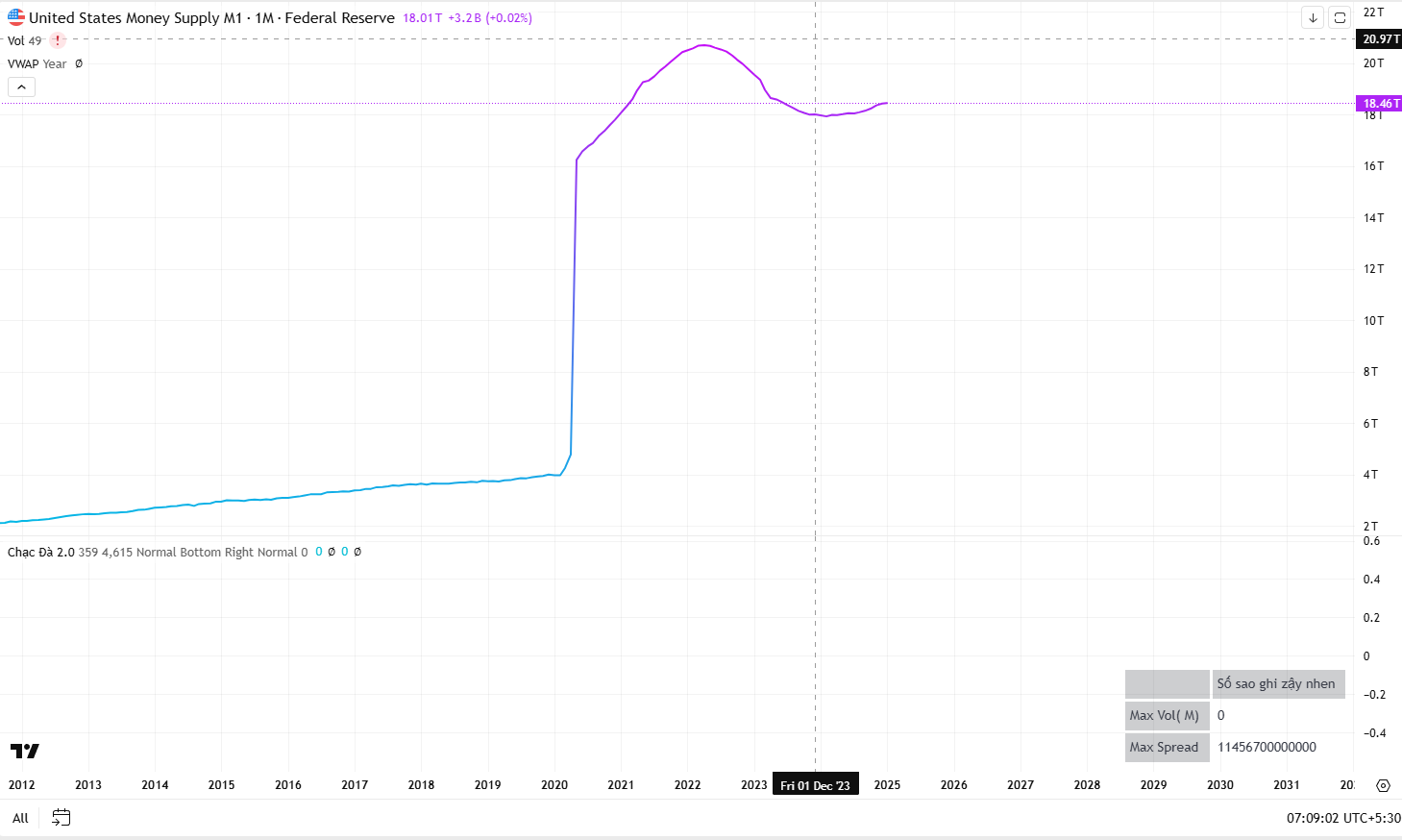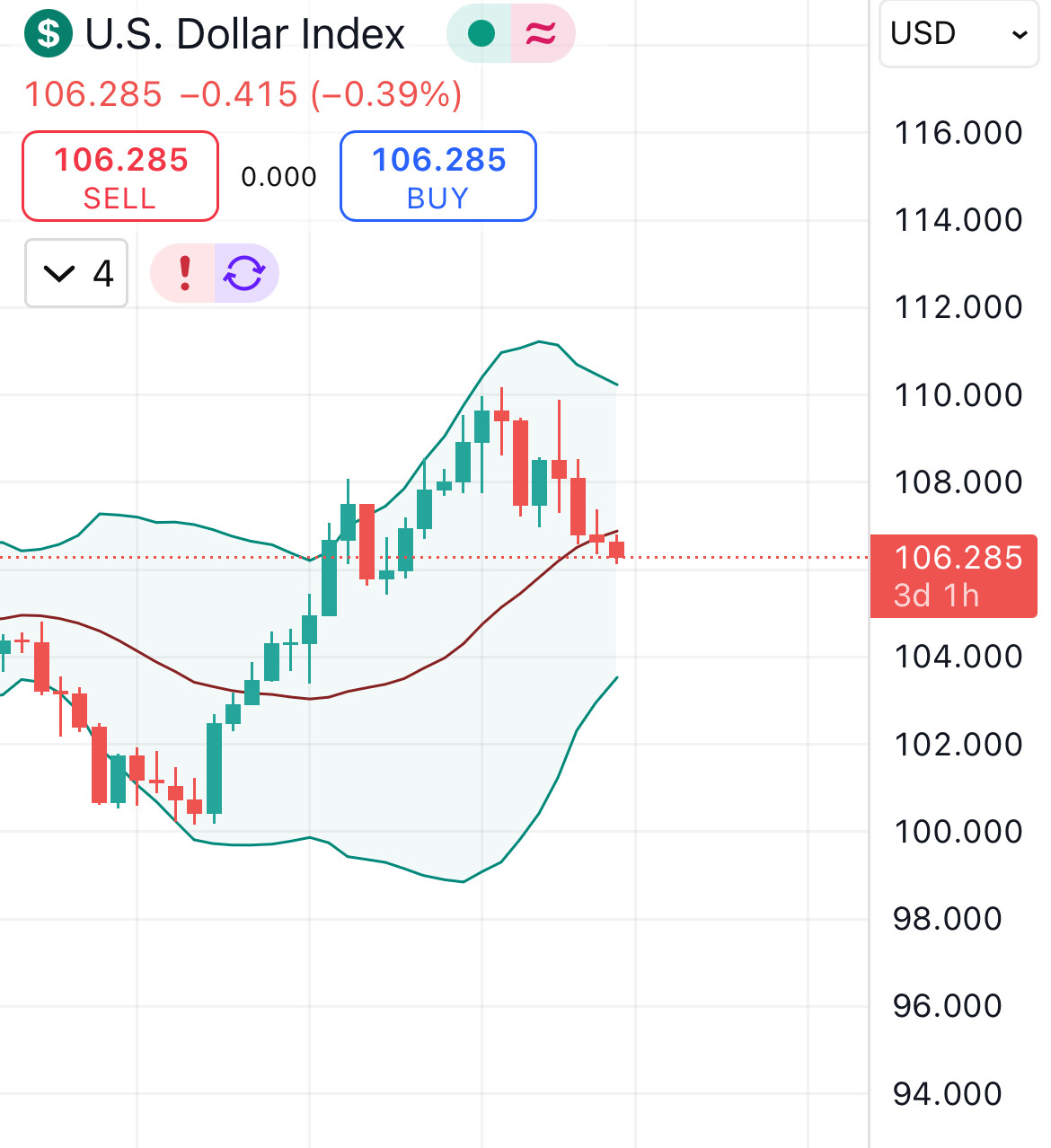 nhìn chạc thì thấy dxy tạo đỉnh. chỉ số đồng đô la suy yếu rồi, tiền đang rẻ, tiền mặt đang lưu thông ngoài thị trường khá nhiều