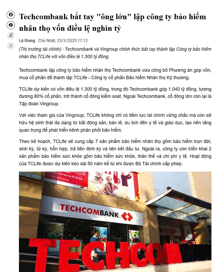 TCB bắt tay Vingroup lập công ty bảo hiểm nhân họ TCLife => cơ hội lớn gia tăng doanh thu từ phí bảo hiểm qua tập khách hàng tiềm năng sẵn có của ngân hàng
