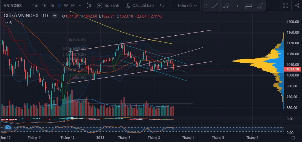 VN-index đã thủng ngưỡng hỗ trợ 1030 cũng là kênh dưới của uptrend kể từ hồi tháng 11/2022 như chúng tôi đã dự đoán từ tuần trước và tư vấn bán trong 3 phiên liên tiếp từ 14/3-16/3. Tuy nhiên tại thời điểm này những ai còn kẹp hàng thì không nên bán tháo nữa mà đợi nhịp hồi của thị trường.