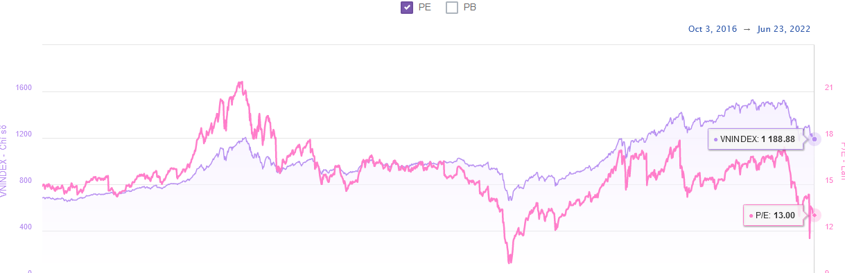 Định giá thị trường: VN-Index đã giảm -24% chỉ trong 3 tháng, đưa Việt Nam vào top 3 TTCK giảm mạnh nhất thế giới trong 2022 chỉ sau Hungary và Nga. Định giá P/E chỉ khoảng 12,5 lần trên cả hai chỉ số VN-Index và VN30( đây là mức định giá thấp nhất trong vòng 5 năm gần đây ngoại trừ giai đoạn covid 2020). Nếu xét đến triển vọng tích cực của kinh tế Việt Nam trong năm 2022 với mức tăng GDP được dự báo trên 6%, cũng như tăng trưởng lợi nhuận doanh nghiệp niêm yết trên sàn dự kiến có thể đạt trên 20% trong năm nay theo như đánh giá của nhiều bên thì P/E Forward của cả thị trường cho năm nay chỉ khoảng 10-10,5 lần (so với mức 15-17 lần của trung bình 5 năm cũng như 10 năm gần nhất), thực sự hấp dẫn cho những nhà đầu tư dài hạn có thể mua vào".