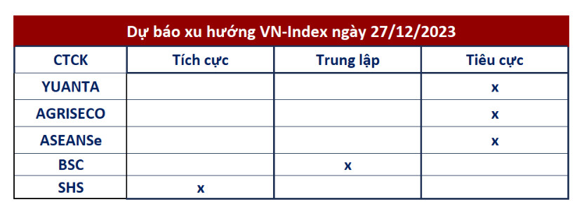 Kết thúc phiên giao dịch ngày 26/12/2023, VNINDEX đóng cửa tăng +4,59 điểm lên mốc 1122,25 điêm với giá trị giao dịch đạt 14.738,59 tỷ. Khối lượng giao dịch dưới mức trung bình 10 phiên và nhỉnh hơn so với phiên giao dịch ngày hôm qua.