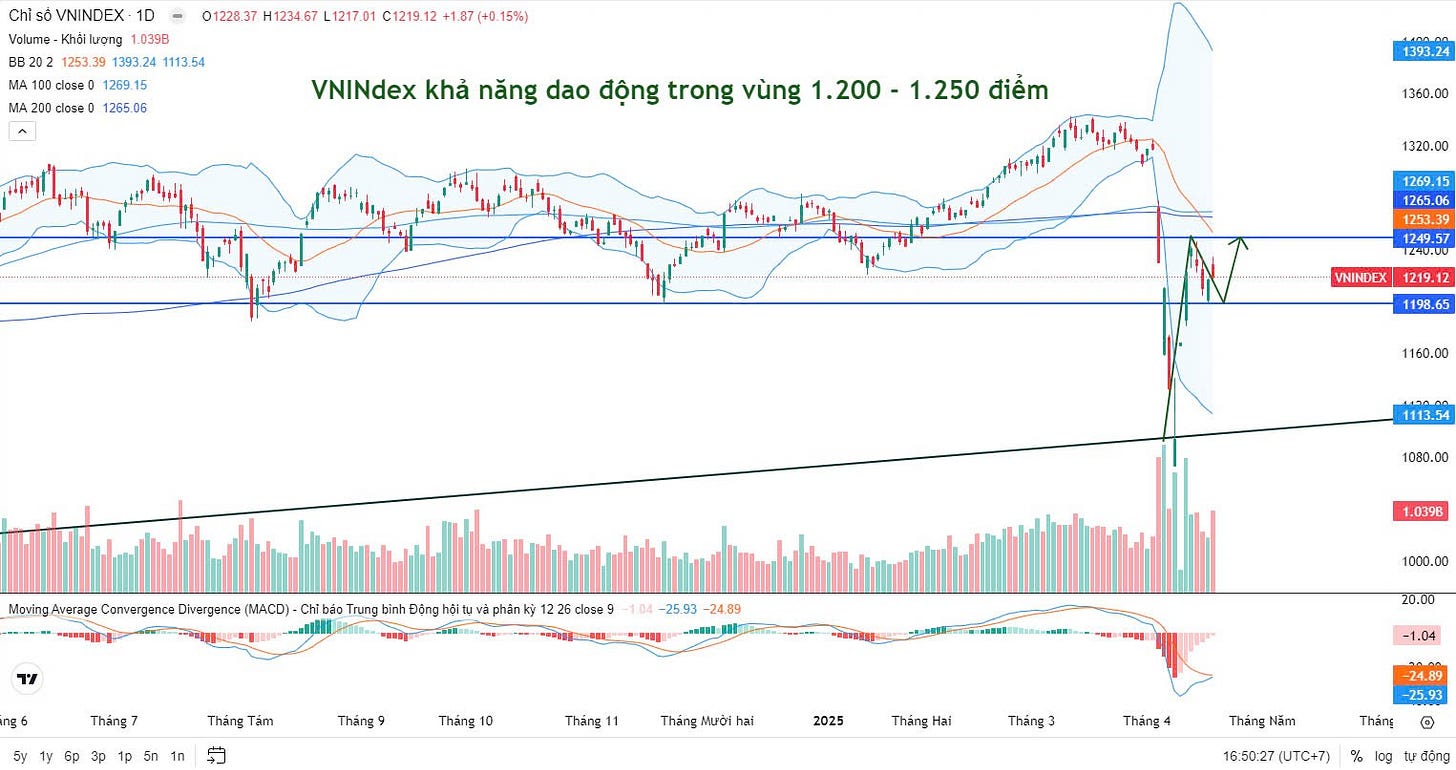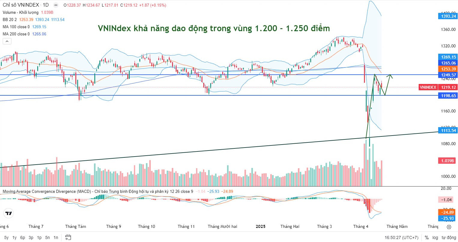 Rung lắc có thể xảy ra trong các phiên đầu tuần. Đây cũng là giai đoạn để thị trường hấp thụ các lượng hàng cung giá thấp/hàng kẹp sau sự kiện Thương Chiến. Nếu thành công, VNIndex sẽ tạo được đáy 2 và đi lên bền vững hơn.