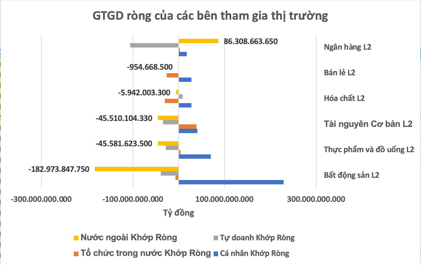 Xét theo nhóm ngành giao dịch, khối ngoại chỉ mua ròng duy nhất nhóm ngân hàng, trong khi bán ròng ở hầu hết các nhóm ngành khác, đặc biệt là bất động sản. Đáng chú ý, lượng bán ra từ khối ngoại dường như được nhà đầu tư trong nước hấp thụ hoàn toàn. Điển hình, nhóm bất động sản ghi nhận áp lực bán mạnh nhất từ khối ngoại nhưng được nhà đầu tư cá nhân trong nước tích cực gom hàng. Trong khi đó, ở nhóm ngân hàng, khối ngoại tích cực nhập hàng còn nhóm tự doanh “xả”.