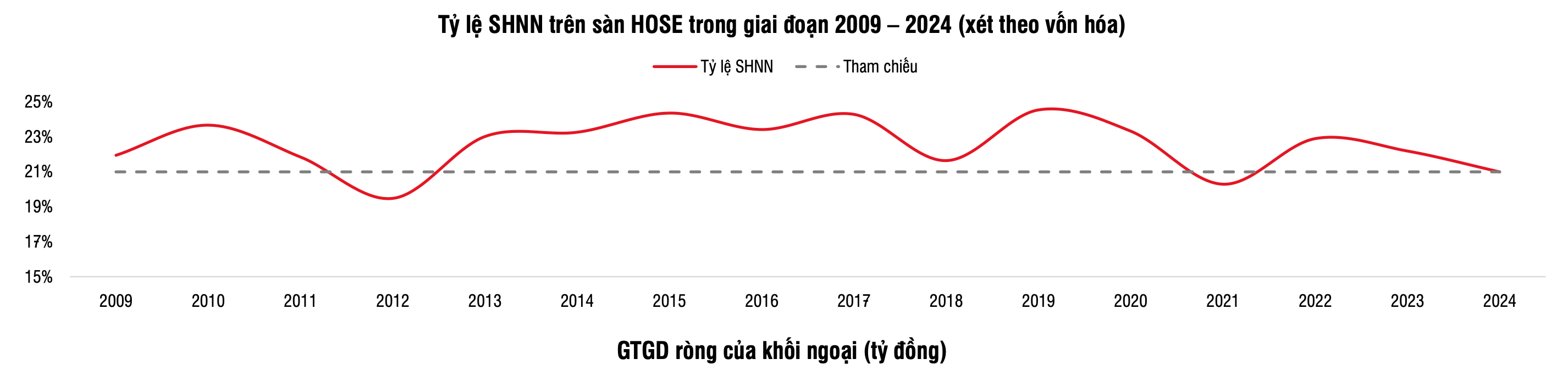 Tính đến hết tháng 11 năm 2024, nhà đầu tư nước ngoài đã bán ròng khoảng 88 nghìn tỷ đồng trên sàn HOSE, mức cao nhất từ trước đến nay. Tỷ lệ sở hữu của khối ngoại, tính theo vốn hóa, đạt khoảng 21% vào ngày 29/11/2024, giảm so với mức 22,2% cuối năm 2023. Tuy nhiên, con số này vẫn cao hơn mức 19,5% của năm 2012 và 20,3% của năm 2021, trong bối cảnh quy mô thị trường đã được cải thiện đáng kể.