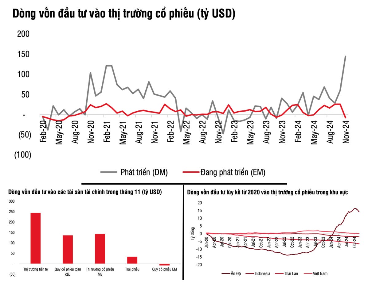 Cũng trong tháng 11, dòng vốn toàn cầu có xu hướng ưu tiên đầu tư vào thị trường cổ phiếu, đặc biệt là các thị trường phát triển như Mỹ, với giá trị giải ngân đạt 114 tỷ USD, tập trung nhóm công nghệ.