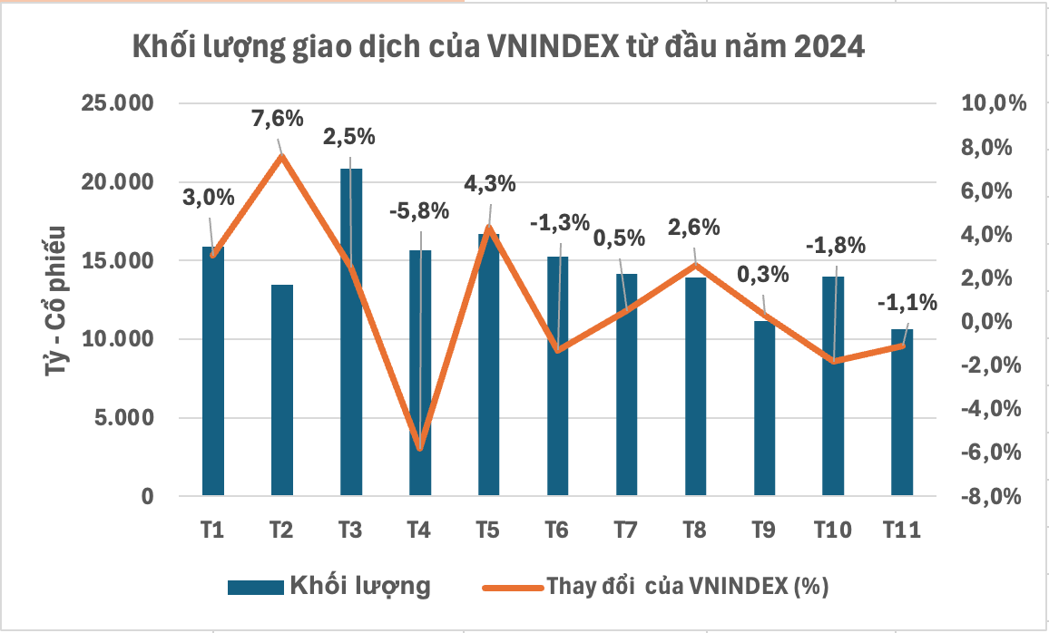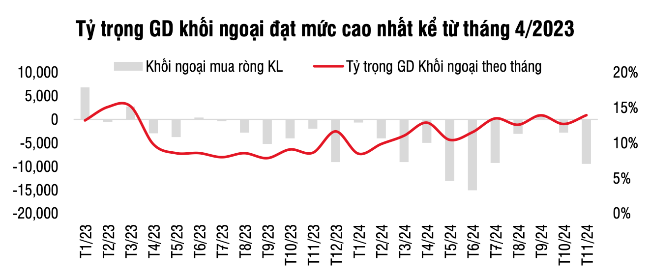 Trong tháng 11/2024, tỷ trọng giao dịch của khối ngoại trên tổng khối lượng giao dịch đạt mức cao nhất từ trước đến nay. Điều này diễn ra trong bối cảnh thanh khoản thị trường tháng 11 thấp nhất từ đầu năm, khiến các động thái của khối ngoại “làm mưa làm gió” trên thị trường, ảnh hưởng lớn đến tâm lý nhà đầu tư và diễn biến của chỉ số VN-Index.