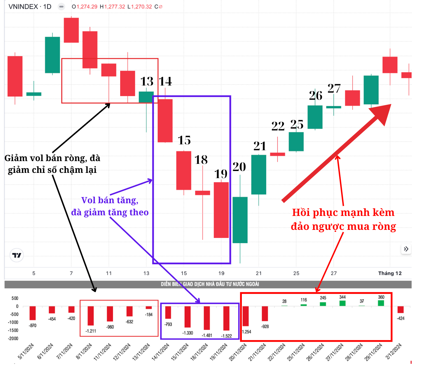 Mặc dù không phải lúc nào cũng có mối tương quan hoàn toàn chặt chẽ, trong tháng 11 thị trường thường giảm mạnh khi khối ngoại gia tăng bán ròng và hồi phục đáng kể khi khối ngoại giảm bán hoặc chuyển sang mua ròng nhẹ. Dù chỉ chiếm trung bình khoảng 10-15% giá trị giao dịch, hoạt động của khối ngoại dường như có thể “lái” tâm lý nhà đầu tư và điều hướng thị trường.