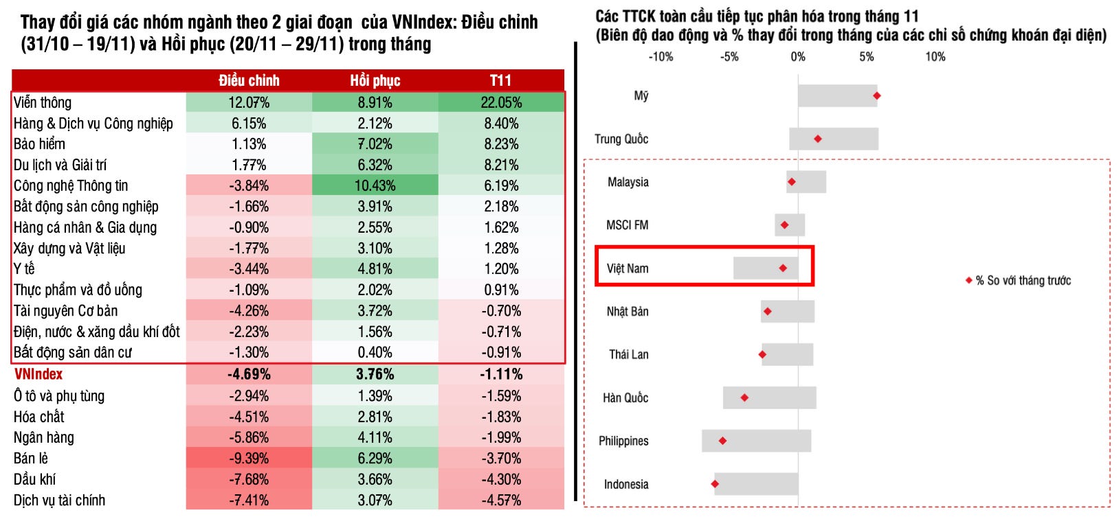Đà giảm của VN-Index trong tháng 11 diễn ra đồng pha với hầu hết các thị trường mới nổi và phát triển trong khu vực, khi dòng tiền rút mạnh khỏi các thị trường này và chuyển về Mỹ. Đáng chú ý, Trung Quốc lại là trường hợp ngoại lệ khi các biện pháp kích cầu kinh tế và chính sách nới lỏng sắp tới đã thu hút lượng lớn dòng tiền từ nhà đầu tư.