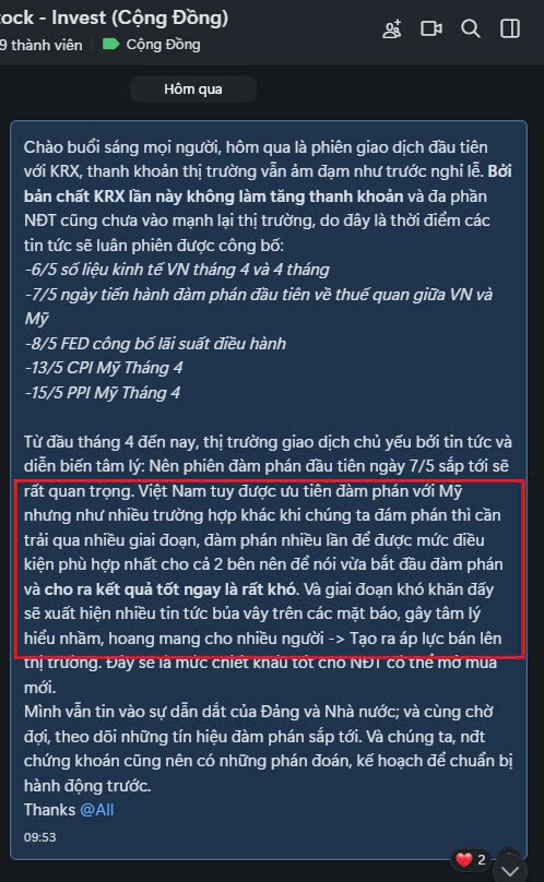 Mình vẫn tin vào sự dẫn dắt của Đảng và Nhà nước; và cùng chờ đợi, theo dõi những tín hiệu đàm phán sắp tới. Và chúng ta, nđt chứng khoán cũng nên có những phán đoán, kế hoạch để chuẩn bị hành động trước.