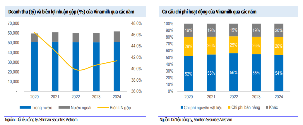 Chi phí chiếm tỷ trọng cao nhất trong cơ cấu chi phí hoạt động của Vinamilk là chi phí nguyên vật liệu (54%), tiếp đến là chi phí bán hàng (26%). Vinamilk thường chốt trước nguyên liệu từ 3-6 tháng, tuy vậy, giá nguyên vật liệu đạt đỉnh năm 2022 cũng khiến biên gộp của doanh nghiệp giảm nhẹ.