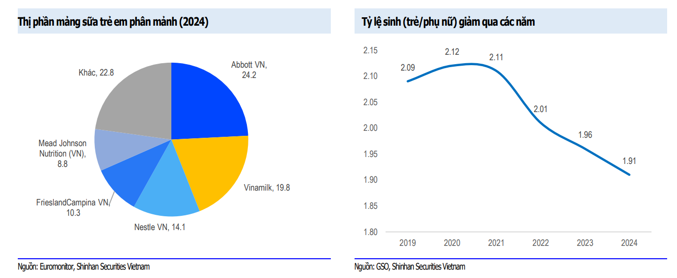 Tiêu thụ sữa trẻ em chiếm 24% tổng tiêu thụ sữa và các sản phẩm từ sữa. Tuy nhiên, mức độ cạnh tranh trong mảng sữa trẻ em giữa các doanh nghiệp là gay gắt nhất khi (1) tỷ lệ sinh tại Việt Nam giảm từ 2.12 trẻ/phụ nữ (năm 2020) xuống 1.91 trẻ/phụ nữ (2024) khiến nhu cầu tiêu thụ sữa trẻ em giảm tốc và (2) xu hướng chi tiêu các sản phẩm cao cấp cho trẻ tăng cao trong khi đó các doanh nghiệp sữa ngoại có lợi thế về thương hiệu hơn. Có thể thấy, doanh nghiệp sữa ngoại đang chiếm thị phần cao hơn so với doanh nghiệp sữa nội là Vinamilk.