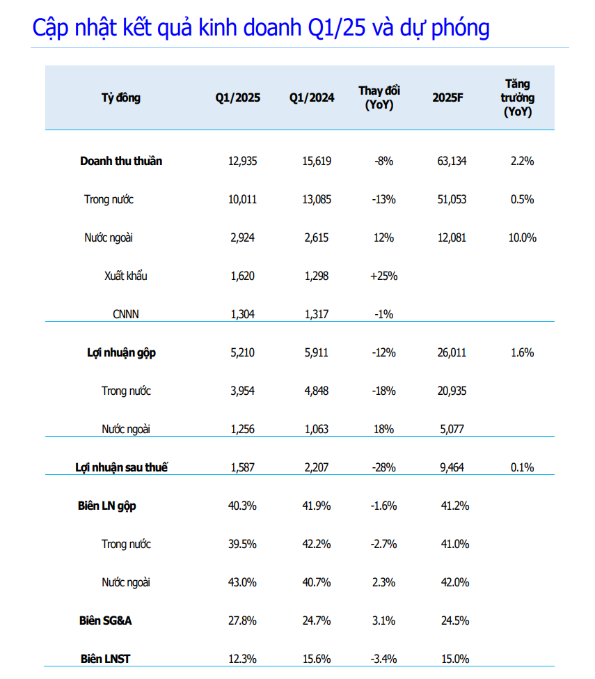 Dự phóng DT thuần 2025 đạt 63,134 tỷ đồng (+2.2% YoY) và LNST đạt 9,464 tỷ đồng (+0.1% YoY). Tuy kết quả Q1 kém khả quan nhưng chủ yếu do ảnh hưởng từ việc tái cấu trúc hệ thống phân phối, kỳ vọng tình hình sẽ cải thiện trong các quý tiếp theo. Hạ dự phóng tăng trưởng thị trường nội địa xuống còn 0.5% so với dự phóng trước đó và nâng dự phóng tăng trưởng của thị trường nước ngoài lên 10% nhờ hoạt động xuất khẩu khả quan hơn dự kiến.