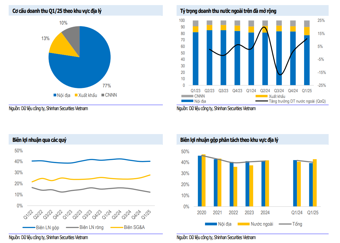 Q1/2025, VNM ghi nhận DT thuần 12,935 tỷ đồng (-8.3% YoY) và LNST 1,587 tỷ đồng (-28% YoY), hoàn thành lần lươt 20% và 16% KH năm. DT thị trường nội địa đạt kết quả kém khả quan khi tăng trưởng âm -13%, trong khi đó thị trường nước ngoài duy trì quý thứ 7 tăng trưởng dương liên tiếp nhờ xuất khẩu tích cực.