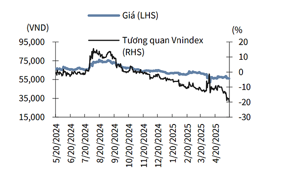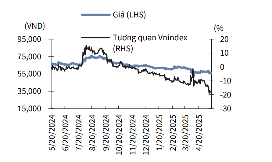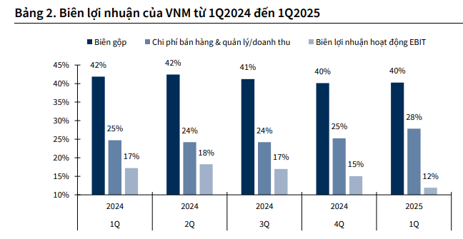 Trước kết quả không khả quan trong quý đầu năm, Vinamilk vẫn giữ nguyên kế hoạch kinh doanh cả năm 2025 với doanh thu mục tiêu đạt 65.505 tỷ đồng và lợi nhuận sau thuế đạt 9.680 tỷ đồng, tương ứng tăng trưởng lần lượt 4,3% và 2,4% so với năm 2024. Tuy nhiên, với quan điểm thận trọng, nhóm phân tích đã điều chỉnh giảm nhẹ dự phóng, đưa doanh thu xuống còn 64.090 tỷ đồng (+3,7% YoY) và lợi nhuận sau thuế đạt 9.219 tỷ đồng (-1,8% YoY), chủ yếu do kỳ vọng thấp hơn về doanh thu nội địa từ sữa nước (không bao gồm Greenfarm) và sữa đặc. Trong khi đó, biên lợi nhuận gộp dự kiến duy trì ở mức 41%, giảm nhẹ 40 điểm cơ bản do chi phí đầu vào tăng khoảng 3,5%, trong khi giá bán chỉ tăng trong khoảng 2,6%–3,5%.