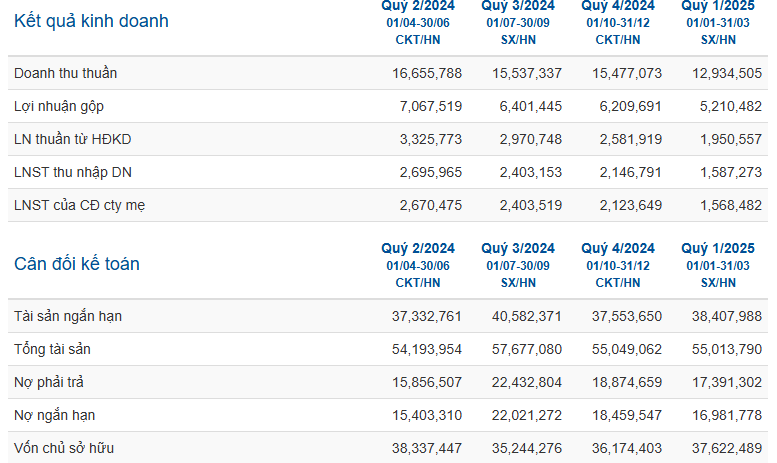 Trong quý 1 năm 2025, CTCP Sữa Việt Nam ghi nhận doanh thu thuần hợp nhất đạt 12.935 tỷ đồng, giảm 8,3% so với cùng kỳ năm trước. Lợi nhuận sau thuế của công ty mẹ đạt 1.569 tỷ đồng, tương ứng mức giảm 28,5% YoY.