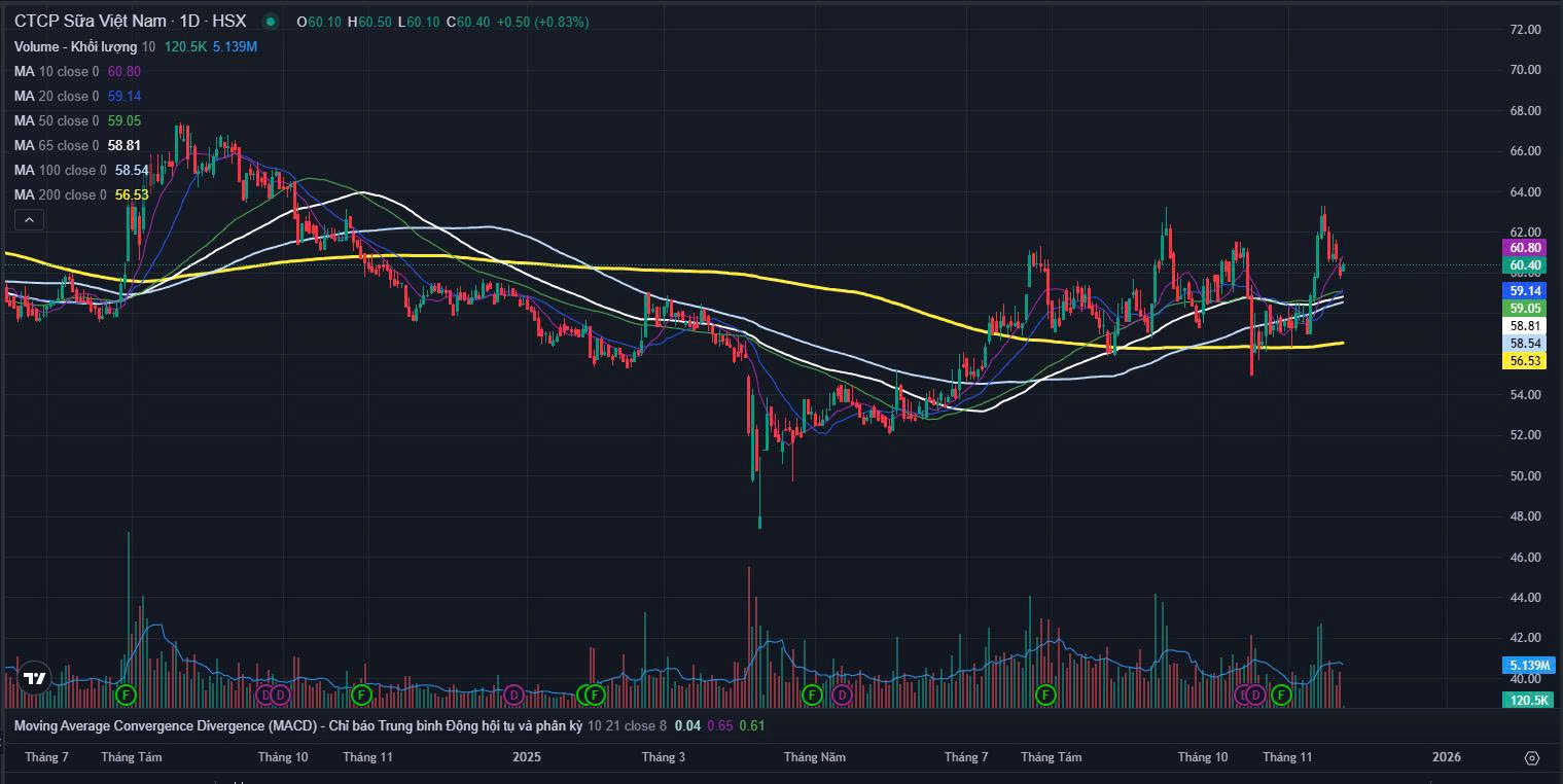 - Q3/2025, doanh thu VNM đạt 16.968 tỷ đồng (+9,1% YoY) và LNST đạt 2.511 tỷ đồng (+4,5% YoY). Lũy kế 9T2025, doanh thu hợp nhất đạt 46.678 tỷ đồng (+0,7% YoY) và LNST đạt 6.586 tỷ đồng (-9,9% YoY).