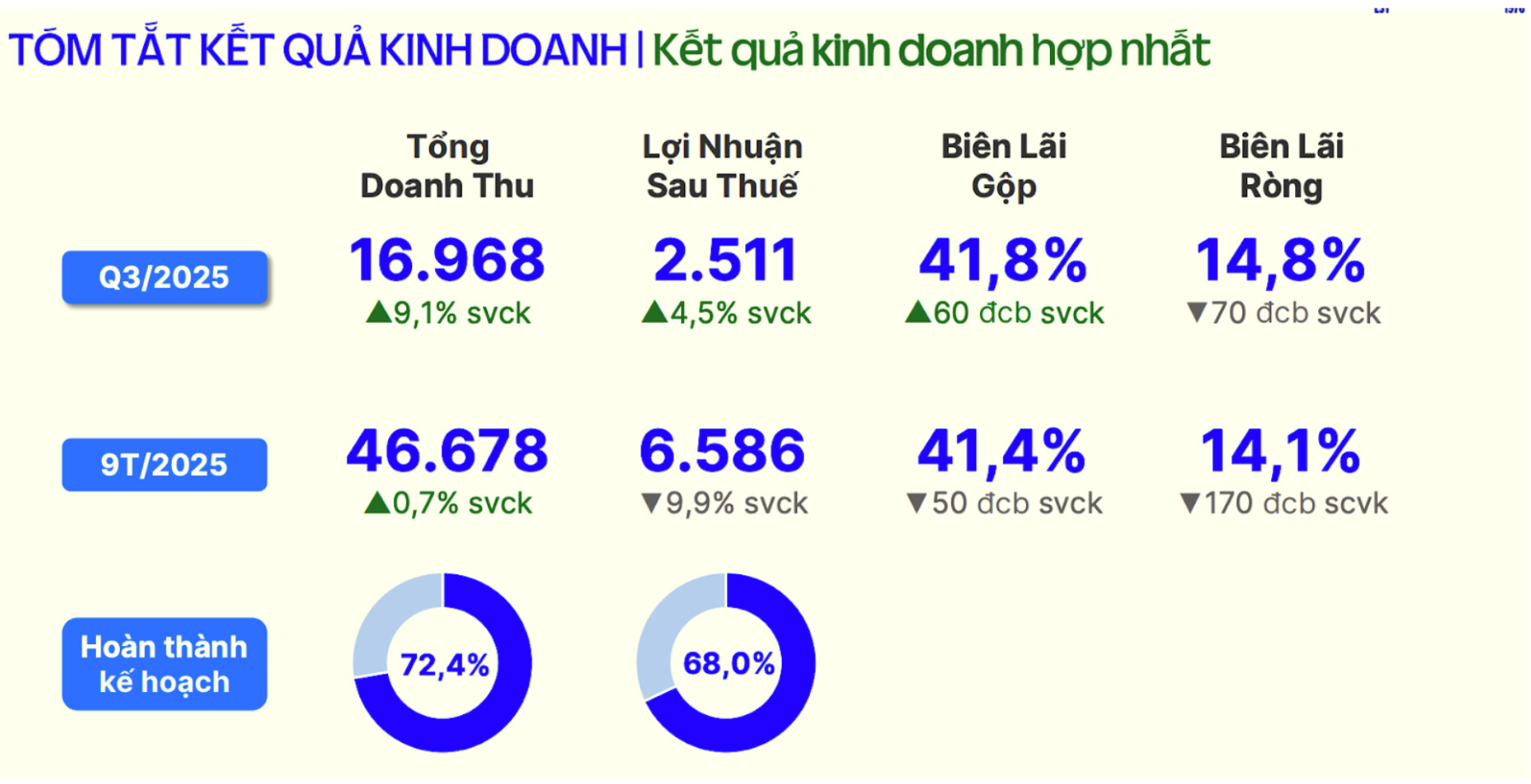 Lũy kế 9 tháng đầu năm 2025, Vinamilk đạt 46.678 tỷ đồng doanh thu thuần hợp nhất, tăng 0,7% so với cùng kỳ, và lợi nhuận sau thuế đạt 6.586 tỷ đồng, giảm 9,9% so với cùng kỳ, phản ánh áp lực chi phí trong giai đoạn đầu năm trước khi kết quả kinh doanh cải thiện rõ rệt trong quý III.