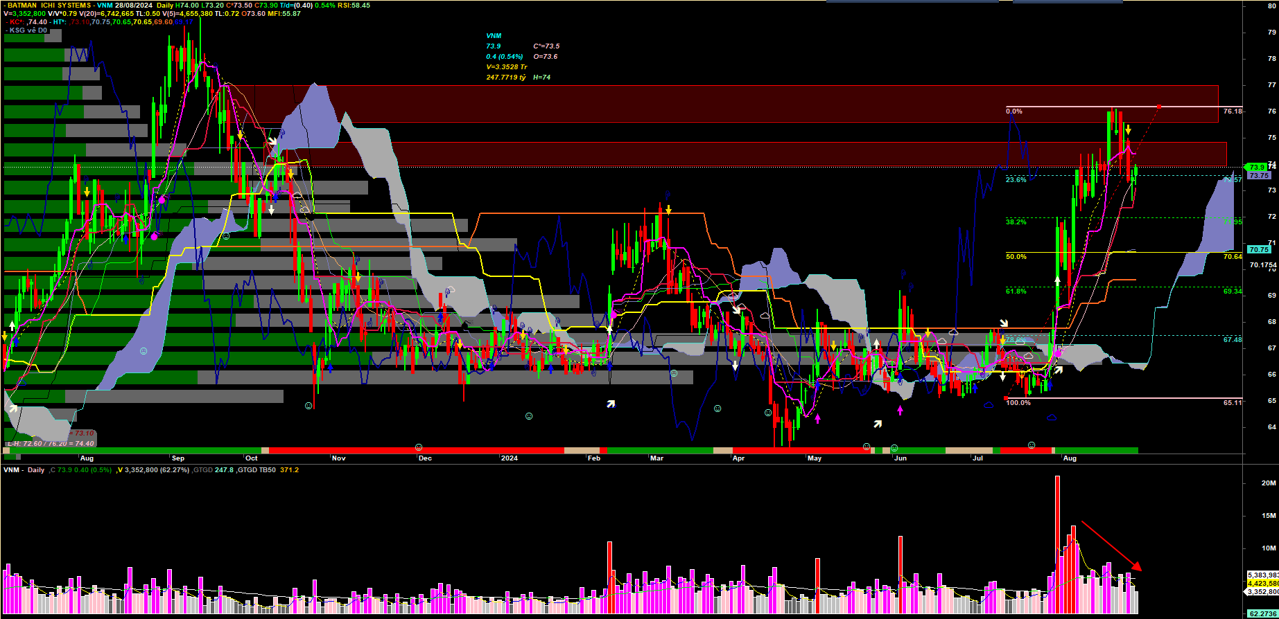 Tóm lại, Vinamilk đang ở giai đoạn quyết định, với khả năng xảy ra một sự đột phá quan trọng. Việc chờ đợi sự xác nhận từ giá phá vỡ các mức kháng cự/hỗ trợ sẽ là chiến lược an toàn để xác định hướng đi của cổ phiếu.
