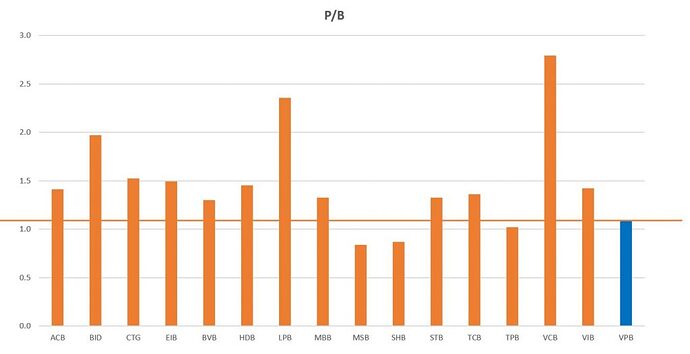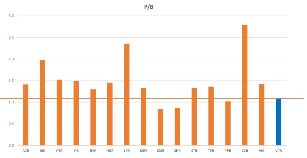 Trong các tiêu chí phân tích ở trên, điểm sáng nổi bật nhất của VPB chính là mức định giá đang khá rẻ. Chỉ số P/B của VPB hiện chỉ khoảng 1,0 lần – thấp hơn rõ rệt so với mức trung bình ngành ngân hàng.