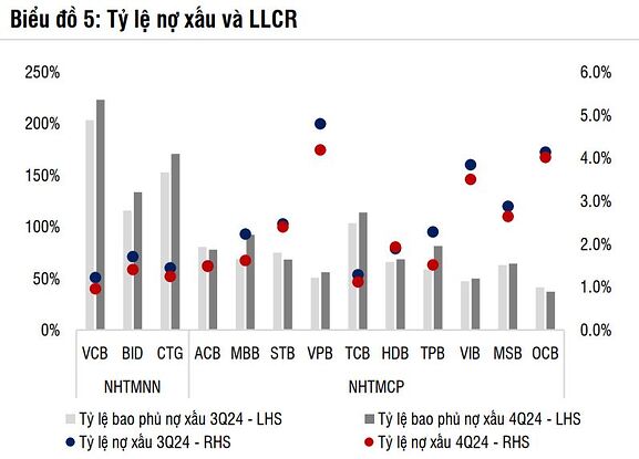 Nhìn chung, trong Quý IV/2024, tỷ lệ nợ xấu toàn ngành đã giảm khoảng 8% so với quý trước, hầu hết các ngân hàng đều ghi nhận xu hướng giảm nợ xấu, phản ánh chất lượng tài sản được cải thiện đáng kể.