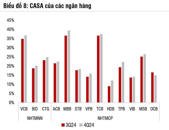 Xét về CASA (Current Account Savings Account) – tỷ lệ tiền gửi không kỳ hạn, là một chỉ số thể hiện khả năng huy động vốn giá rẻ rất tốt, giúp giảm chi phí đầu vào. Trong Quý IV/2024, ba ngân hàng có lợi thế vượt trội về CASA với tỷ lệ trên 35% gồm: VCB (Vietcombank); MBB (MB Bank); TCB (Techcombank)