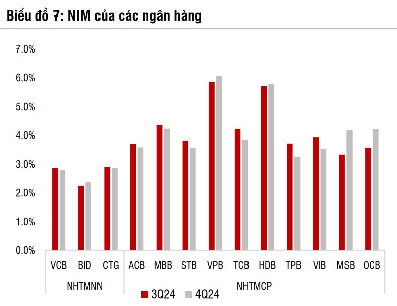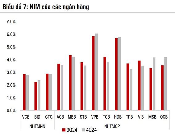Xét về NIM thì có thể thấy một số ngân hàng đang duy trì lợi thế vượt trội: dẫn đầu là VPB 6% thể hiện mô hình tín dụng bán lẻ đang khá hiệu quả. Các mã có tốt còn lại là: HDB, MBB hay TCB.